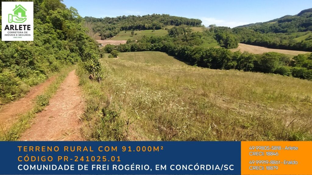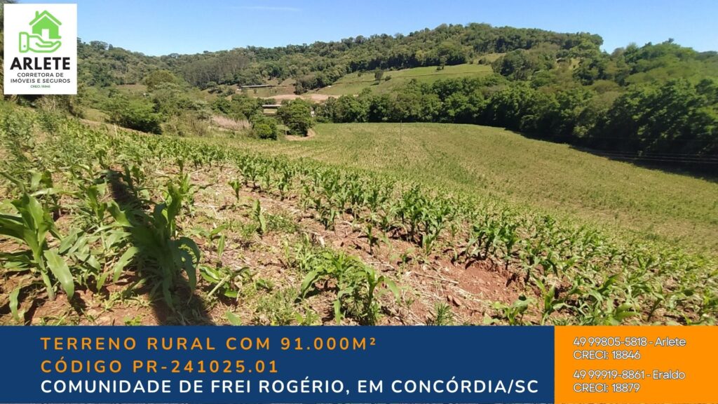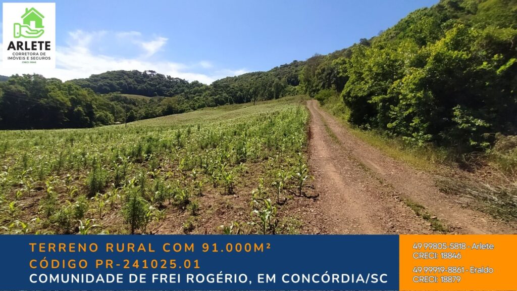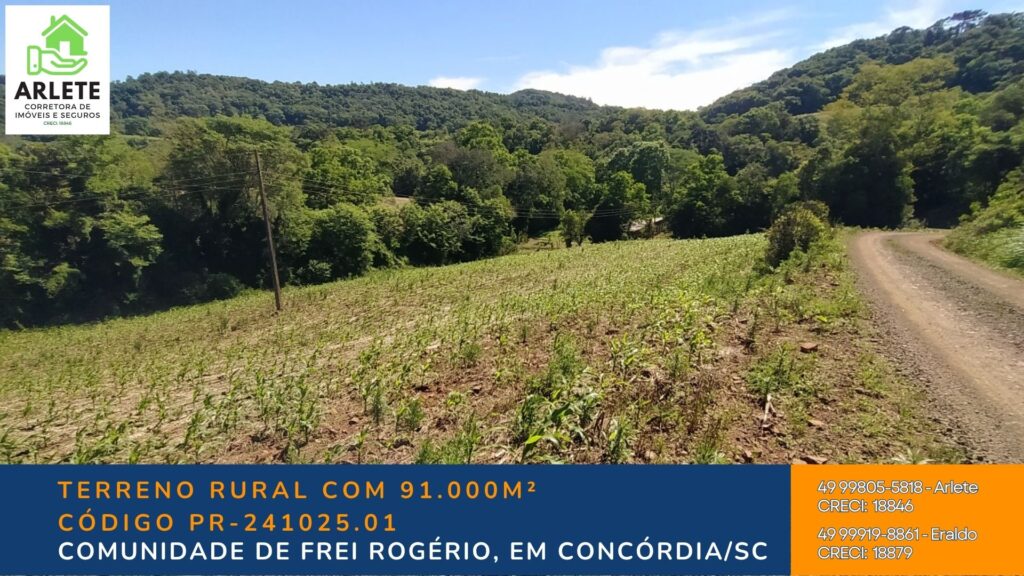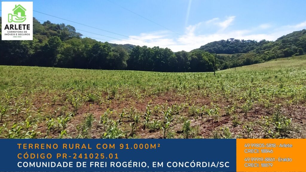Localizada a apenas 3 km da Rodovia BR-153, na região de Frei Rogério, esta propriedade possui 91.000m² (9,1 hectares) com características perfeitas para uso agrícola, ecológico ou de lazer.