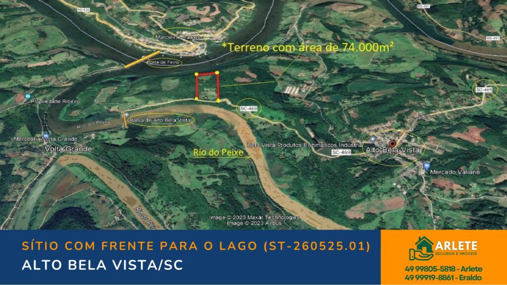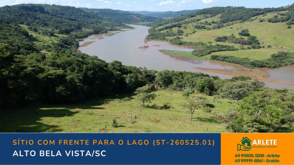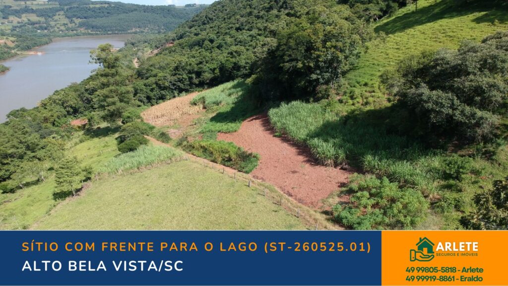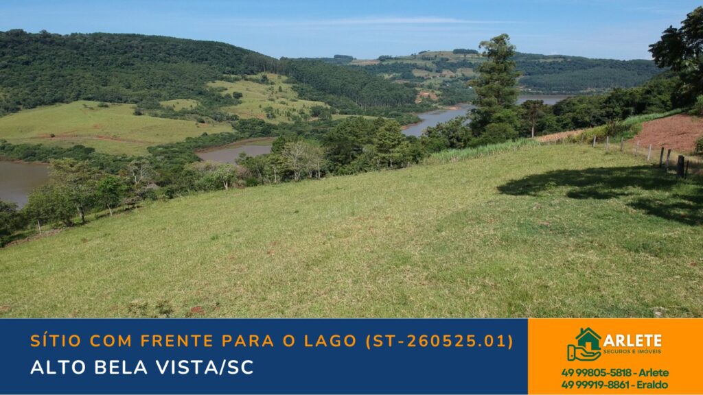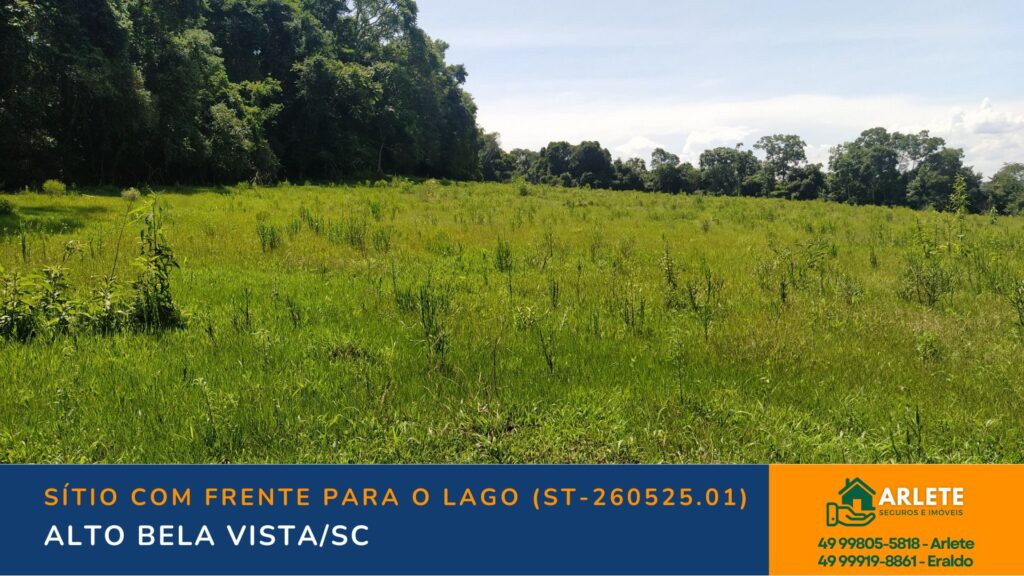 Sítio de 7,4 hectares com excelente localização em Alto Bela Vista/SC, apenas 2 km do centro. Possui casa com 4 quartos, pastagens, lavoura, frente para o lago e várias benfeitorias.